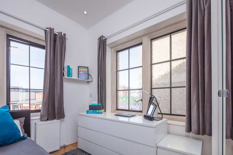 Our Accessible Studio is a large studio spread over 30sqm. The space has been specifically designed and adapted for students with disabilities or specific requirements. There is as wider hallway allowing wheelchair access and enough space for the student to manoeuvre. We can also alter the studio to fit the specific needs of the tenant. The studio also benefits from having a walk-in shower with handrails, and a shower seat. There is also a fully fitted kitchen. You will be able to make your studio your own as it comes fully furnished with freestanding furniture. The studio is available to rent for 51 weeks, if you require a shorter stay, please speak to a member of staff. Please note, there is an additional charge of £60.00 per week for dual occupancy.