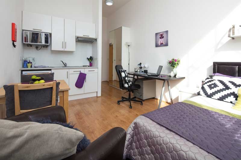 The Gold Plus Studios benefit from a spacious layout spread out over 23sqm. Like our Gold Studios they also benefit from having high ceiling and large windows. With the additional space, these studios are ideal for dual occupancy or for just one person. The studios all have their own en-suite bathrooms and fully fitted kitchens and are fully furnished. The furniture isn’t fixed to the walls or floor so you are able to create your only personal layout. Some of our Gold Plus Studios have some pieces of the building’s history such as the tiles. The Gold Plus Studios are available to rent for 51 weeks, if you require a shorter stay, please speak to a member of staff. Please note, there is an additional charge of £60.00 per week for dual occupancy.