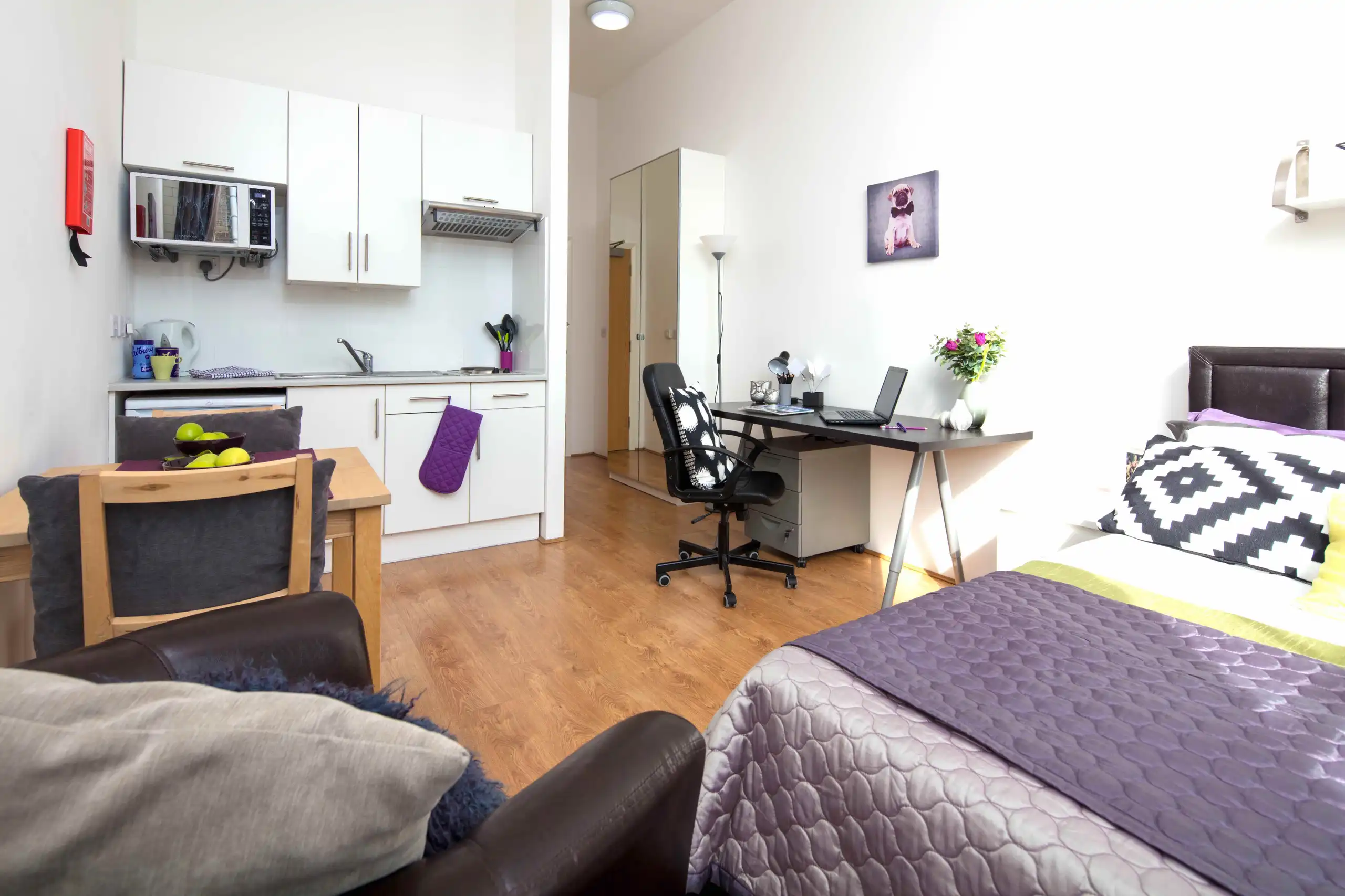 Our Gold Studios are spacious and spread over 21sqm. They are self contained studios with en-suite bathrooms and fully fitted kitchens. The studios also benefit from being fully furnished. The furniture isn’t fixed to the walls or floor so you are able to create your own personal layout. The Gold Studios also allow you bring additional furniture or the things you can’t live without. The studios are available to rent for 51 weeks, if you require a shorter stay, please speak to a member of staff. Please note, there is an additional charge of £60.00 per week for dual occupancy.