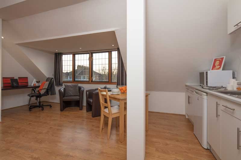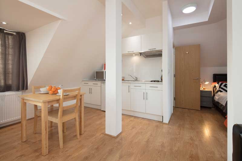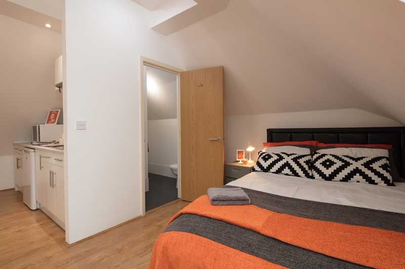The Penthouse is the largest studio we offer here at Smart Student Accommodation spread over 34sqm with a stunning layout and views overlooking Finsbury Park. The Penthouse is located in the original part of our grade two-listed building. The apartment comes fully furnished and includes a sofa. The furniture is freestanding and your are encouraged to create your own personal layout. It’s an amazing space that can be divided up into different areas including your bedroom, a study area, and a living/ dining area. The possibilities are endless. Our Penthouse is prefect for either a couple or a single tenant who enjoys having lots of space and entertaining friends or just having quiet nights staying in and studying. It is a self contained studio with your own fully fitted kitchen and en suite bathroom.